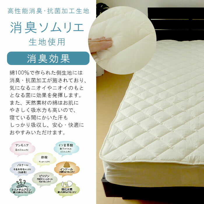 消臭ソムリエ生地使用 制菌綿入りベッドパッド 高性能消臭・抗菌加工生地と制菌タイプの中わたを使用 日本製 表地コットン100%合繊敷きパッド シングルサイズ 100×200cm ※画像はシングルサイズを使用しております。