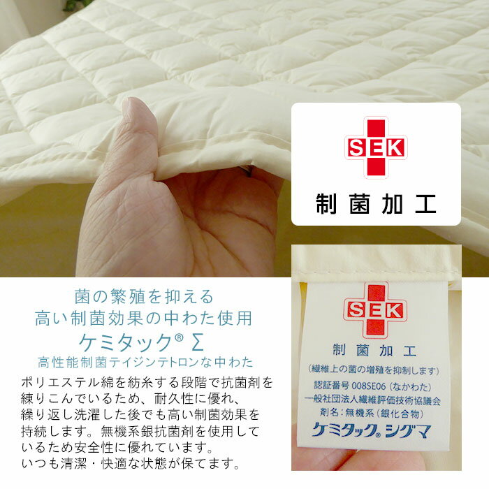 菌の繁殖を抑える高い制菌効果の中わた使用(SEK赤ラベル) ケミタックΣ(高性能制菌テイジンテトロン中わた) ポリエステル綿を紡糸する段階で抗菌剤を 練りこんでいるため、耐久性に優れ、 繰り返し洗濯した後でも高い制菌効果を 持続します。